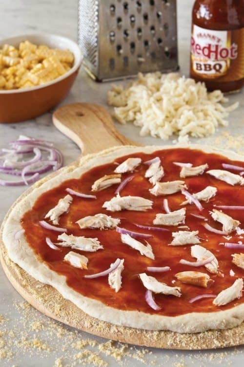 the pizza. Cover the pizza with half the cheese, chicken, corn, and red onion. Drizzle
