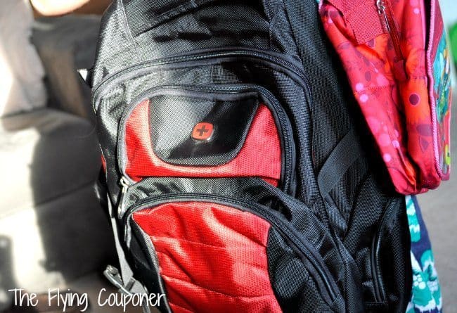 We also got the Swiss Gear backpack with compartments in black and red. It’s a gorgeous backpack with a large main compartment and a padded back for comfort. There are a lot of compartments and a super comfortable top carry handle. We also like it’s side compression straps and the reflective label on the shoulder straps for safety.