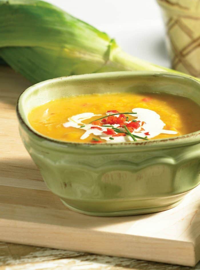 3. Working in batches, purée soup in a food processor or blender. (You can also do this in the stoneware using an immersion blender.) To serve, ladle soup into bowls, drizzle with cream and garnish with roasted red pepper strips, if using, and chives.