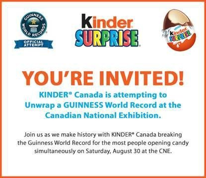 Come down to the Canadian National Exhibition (CNE), 210 Princes’ Blvd, at Bandshell Park near the Kid’s World at 10:20 a.m. At 10:40 a.m., everyone will get a KINDER egg and at 11:00 a.m., we will officially attempt to break the Guinness World Record.